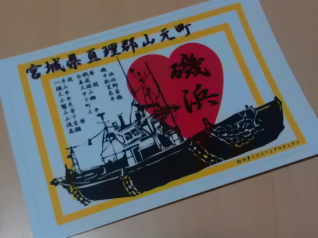 これは山元町にある震災の被害を受けた磯浜漁港の「復興の足掛かりになれば」と、秋田から来た女性のボランティアの方が製作した1枚500円のステッカーで、収益は大漁旗の作成からスタートし、次は漁具などの購入に充てられるそうです。