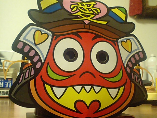 昨晩、豆まきの豆を買いに行ったら、昨日アップした画像に写っていた『でん六』の“2009でん六節分キャンペーン”キャラ【ラブ鬼】のお面をゲッチュ!!